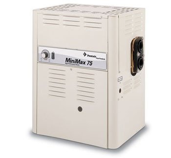 The MiniMax 100 is a compact, lightweight and efficient gas fired high performance aboveground pool and spa heater. It can be connected to schedule 40 CPVC or ABS pipe and has a built-in top. It includes quiet and dependable operation from packaged burner system, bronze headers, quick flange allow 1-1/2 FIP connect, the controls have been designed for very easy access and are user friendly, low profile and lightweight, perfect for one-man installation and it installs to 3,500-feet altitude. Reliable direct-spark ignition system is available in natural gas versions.