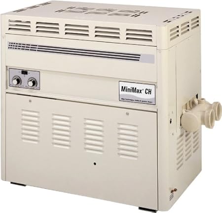 This MiniMax CH natural gas high performance millivolt ignition heater features precision dual electronic thermostat, easy-to-install CPVC bulkhead connections and reversible headers allowing direct PVC connections, low profile design with rounded corners, standard balanced flue stackless top for outdoor installation, designed for high efficiency. The 3000-5999-feet is an altitude range.